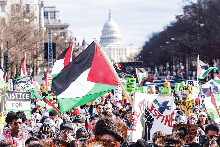 WASHINGTON — Thousands of demonstrators converged opposite the White House on Saturday to call for an end to Israeli military action in Gaza, while children joined a pro-Palestinian march through central London as part of a global day of action against the longest and deadliest war between Israel and Palestinians in 75 years.