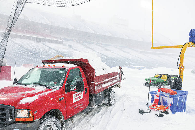 Workers with shovels and trucks worked to clear snow from the field at Buffalo’s Highmark Stadium as the Bills warned volunteers eager to help with the shoveling to stay at home and not defy a travel ban on area roads.