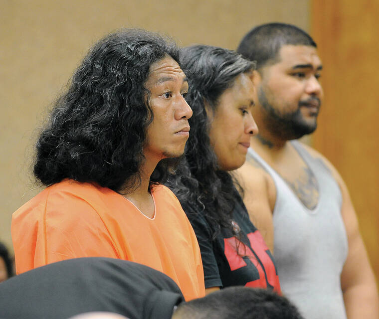 Lama Lauvao, left, Natisha Tautalatasi and Wesley Samoa make their initial court appearance in 2018. (Laura Ruminski/West Hawaii Today file)