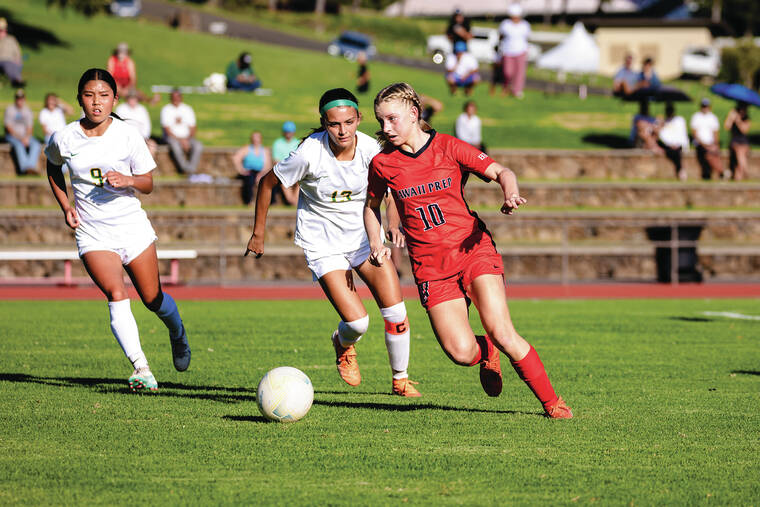 “(Kepoo-DeConte) is our quiet leader in the back,” Hock said. “She’s steady. During the Waiakea game last week she got a bit rattled, but she’s just as mentally strong as Kryslynn up front. They both kind of are our two boundaries on both sides of the field, and I also have (Leililian Solomon Hoopai) in the middle who’s the other heart of the team.”