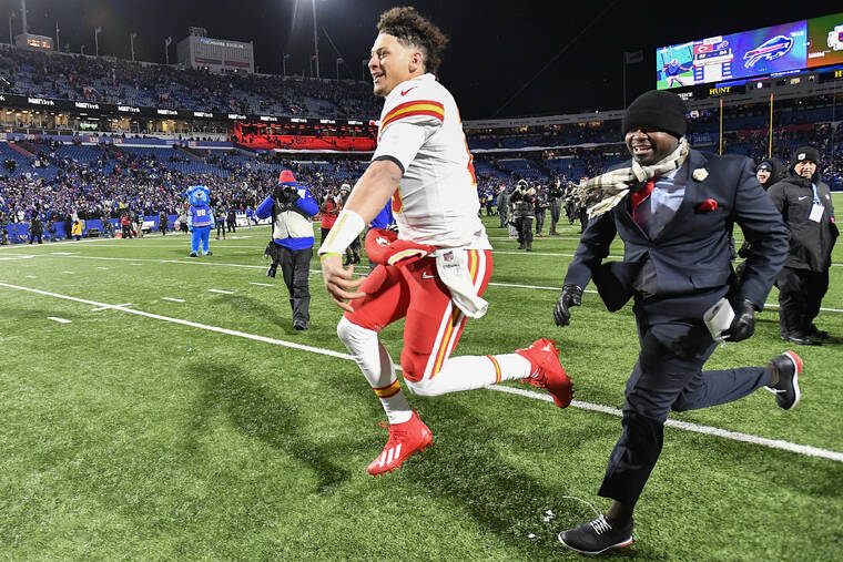 Mahomes led the Chiefs to a comeback win over Josh Allen and the Buffalo Bills in the divisional round in his first career playoff game on the road aside from Super Bowls.