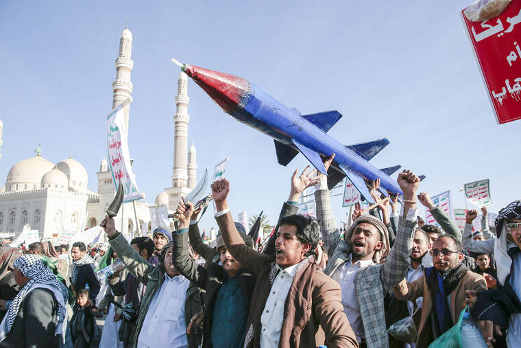 JERUSALEM — Yemen’s Houthi rebels launched a missile Friday at a U.S. warship patrolling the Gulf of Aden, forcing it to shoot down the projectile, and struck a British vessel as their aggressive attacks on maritime traffic continue.
