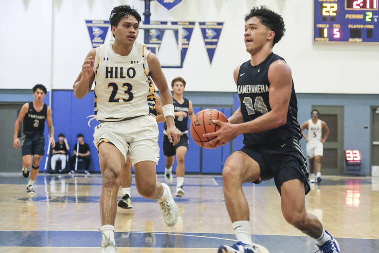 The Kamehameha Schools – Hawai‘i boys varsity basketball team secured its No. 1 spot in BIIF Division I — emerging victorious, 49-46, from a scrappy and fast-paced showdown against home standing Hilo High on Saturday night.