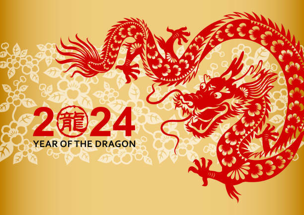 Celebrate the Year of the Dragon 2024 with red papercutting dragon on floral background, the Chinese stamp means dragon