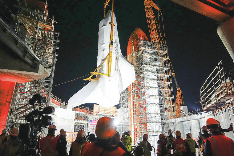 A massive crane delicately moved the orbiter, which is 122 feet (37 meters) long and has a 78-foot (24-meter) wingspan, into the partially built Samuel Oschin Air and Space Center at the California Science Center in Exposition Park.