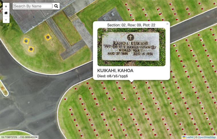 The online map gives viewers an overhead view of the cemetery, located at 150 Kapiolani St., where they can click on each gravesite or search for a grave by name.