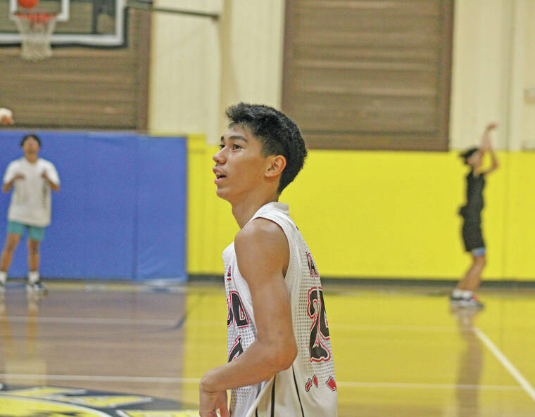 The Cowboys' Layden Kauka shoots jump shots during Tuesday's practice at Kohala High School. (Conor Langs/West Hawaii Today)