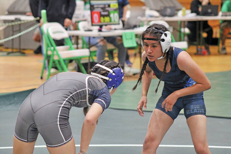 Waiakea's Charlese Spain (left) and Kealakehe's Raesha Aurelio (right) matchup up during the BIIF's sixth wrestling meet of the season Saturday at Konawaena High School. (Conor Langs/West Hawaii Today) ▲