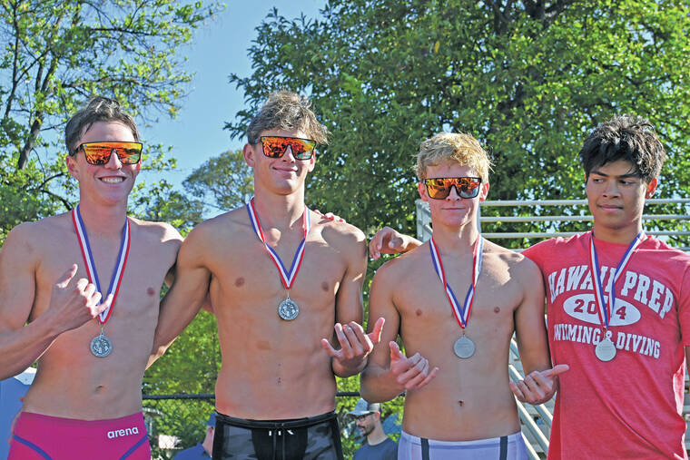 HPA boys swimming stands on the podium after placing second overall in the HHSAA Boys Swimming and Diving Championships on Saturday on Maui. (Hawaii Preparatory Academy/Courtesy Image)