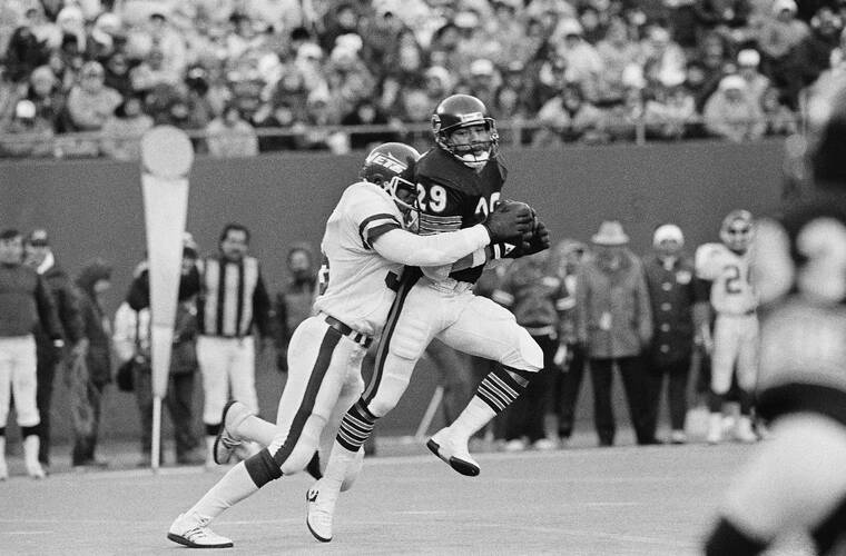 Chicago Bears Dennis Gentry is hit by New York Jets Rich Miano as he takes pass for a 7-yard game in fourth quarter of game on December 14, 1985 in East Rutherford, N.J. Bears won game, 19-6. (AP Photo/G. Paul Burnett)