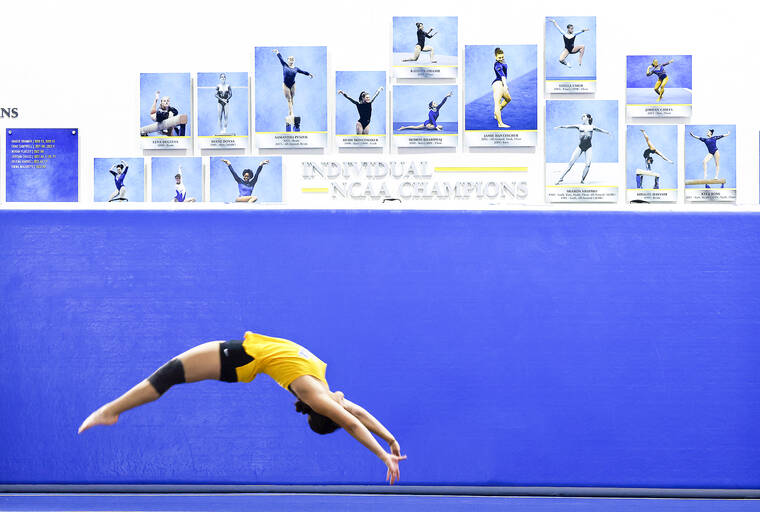 LOS ANGELES — At 7:20 a.m. sharp, Emma Malabuyo steps out of the elevator across from Pauley Pavilion. A poster of her dressed in a sparkly blue leotard faces the front door of UCLA’s Acosta Training Center. It represents only one of the junior’s goals on this campus.