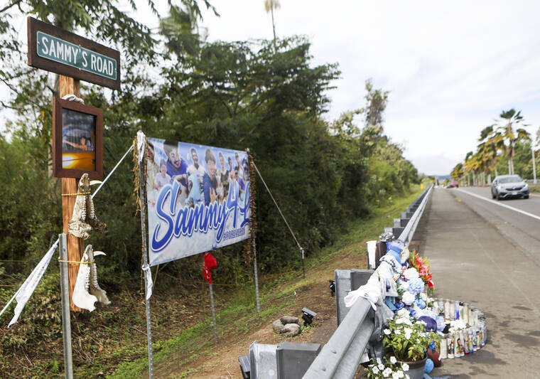 Kelsey Walling/Tribune-Herald A memorial for Sam Mwarey is shown Friday on Kapiolani Street in Hilo, on the day he was laid to rest. Loved ones have left flowers, photos, mementos and have dubbed the portion of the street "Sammy's Road."