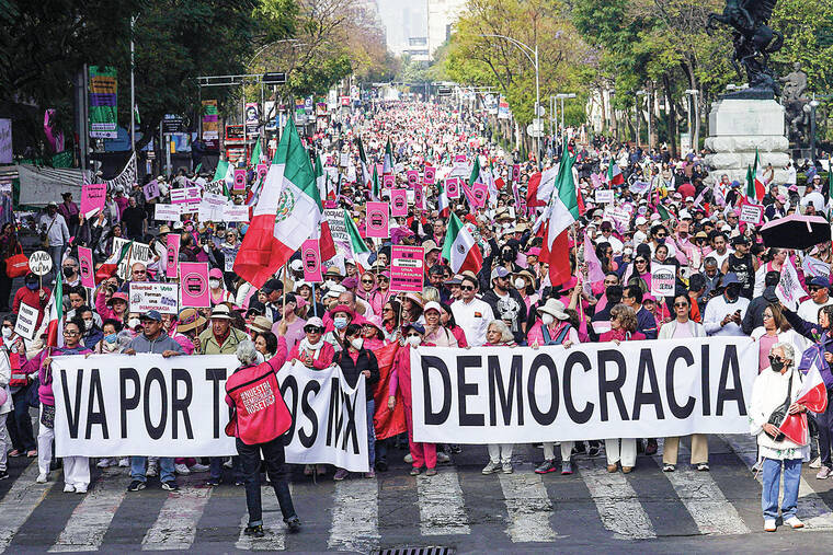 MEXICO CITY — Tens of thousands of demonstrators cloaked in pink marched through cities in Mexico and abroad on Sunday in what they called a “march for democracy” targeting the country’s ruling party in advance of the country’s June 2 elections.