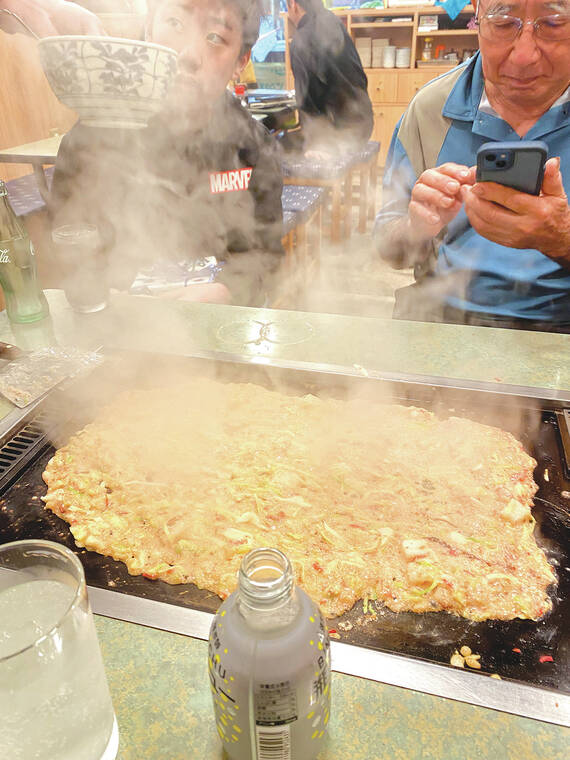 The tables all had a grill in the middle for cooking and my son Reid thought we had to cook it ourselves, which he did in December while working in Tokyo during the holidays, but the workers at the restaurant prepared everything for us. Starting with a bowl of chopped vegetables that are fried on the grill, then some dashi (a simple broth made by simmering dried kelp and bonito flakes in water), flour and sauce, giving it a more dough-like consistency.