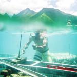 He’s quick to slide his board into one of the glassy tubes, gliding out before the wave thunders down onto the reef, a monstrous spray of lapping white froth raining down behind him.
