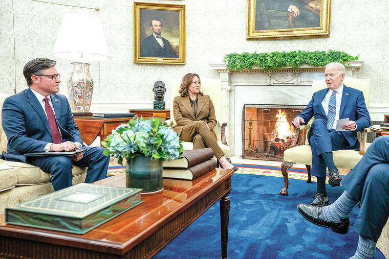 WASHINGTON (AP) — Congressional leaders emerged from an “intense” Oval Office meeting with President Joe Biden on Tuesday speaking optimistically about the prospects for avoiding a partial government shutdown, but with new uncertainty about aid for Ukraine and Israel as the president and others urgently warned Speaker Mike Johnson of the grave consequences of delay.