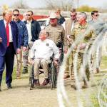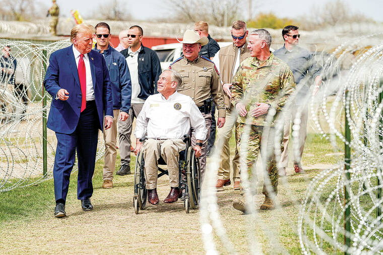 He traveled to Eagle Pass, roughly 325 miles northwest of Brownsville, in the corridor that’s currently seeing the largest number of migrant crossings. He met with Republican Gov. Greg Abbott and Texas National Guard soldiers who have commandeered a local park and put up razor wire fencing at the river’s edge to keep migrants from crossing illegally. The park has become a Republican symbol of defiance against the federal government.
