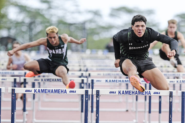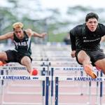 Pahoa's Kaumuali‘i Gancina (left) and Konawaena's Laanui Meyers approach the finish line during the boys 300 meter hurdle race on Saturday at KS-Hawai‘i.