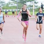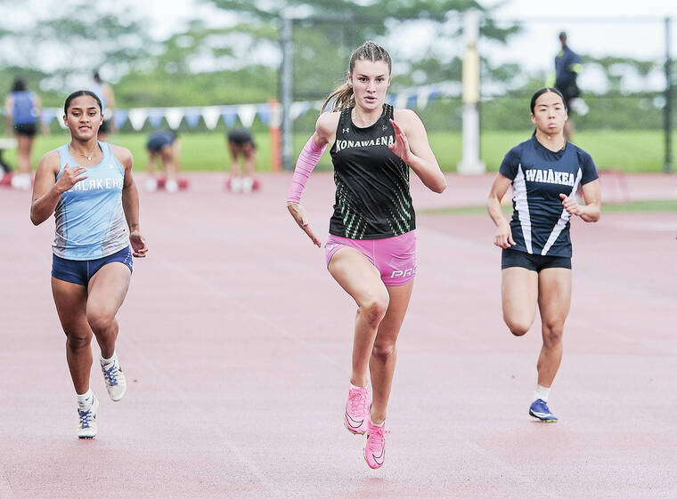 From left, Kealakehe's Layla Grace, Konawaena's Violet Schaut and Waiakea's Maya Kaneshiro approach the finish line during the first heat of the girls' 100 meter dash on Saturday at KSH.