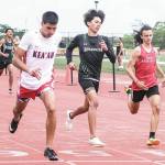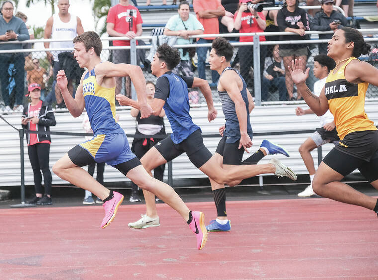Laupahoehoe's Xavier Abair (left) places first in the third heat of the boys' 100 meter dash on Saturday at KS-Hawai‘i.