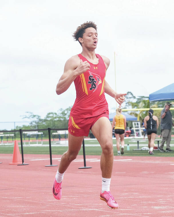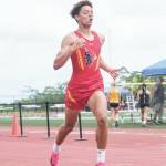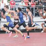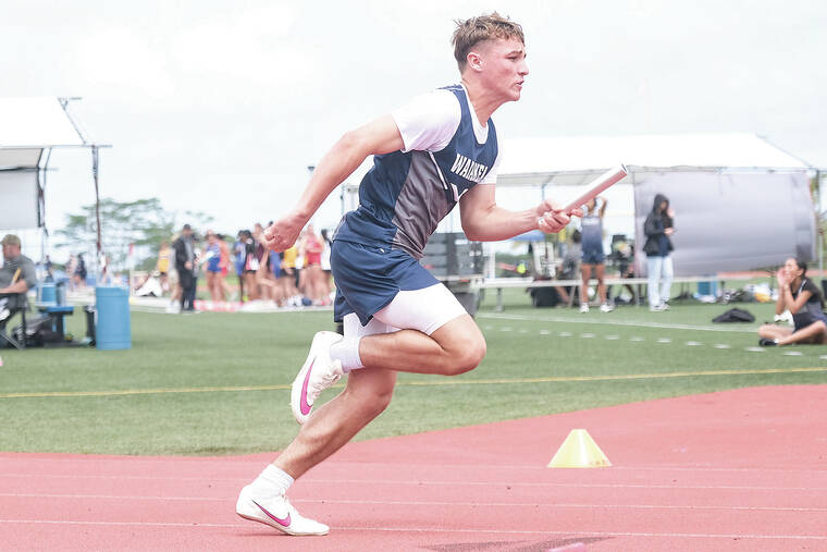 Waiakea's Justin Ah Sing takes off during the boys 4x100 relay event on Saturday at KSH.