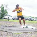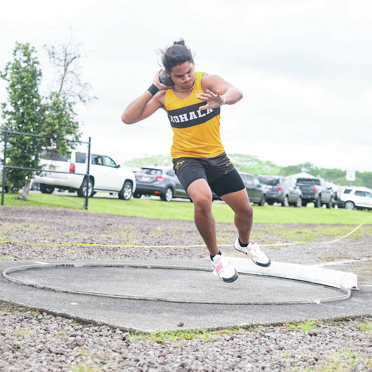Kohala's Sheldon Ancheta-Ahpuck throws a shot put during the season's first BIIF track meet on Saturday at KSH.