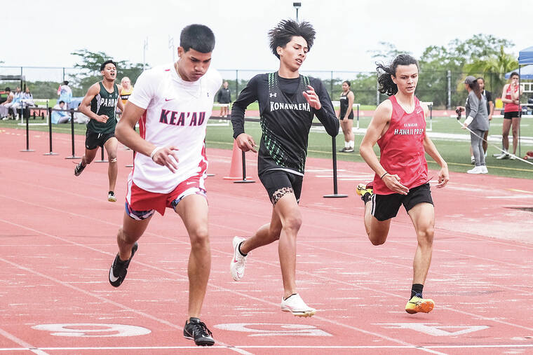 From left, Sean Randall, Kea Sanders and Jack Soon-Ludes cross the finish line during a heat of the boys' 400 meter dash on Saturday at KSH.