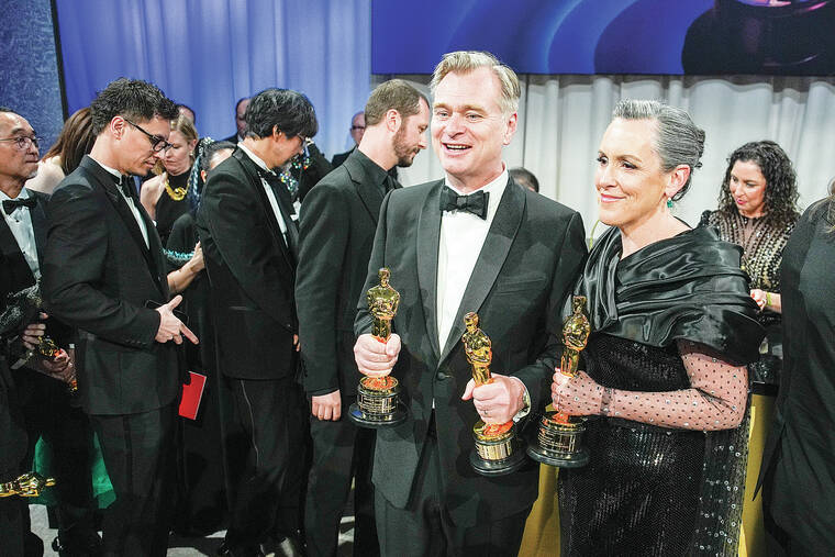 Nolan’s wife, “Oppenheimer” producer Emma Thomas, held her own statuette, for best picture, and did most of the talking as waves of well-wishers descended on the couple.