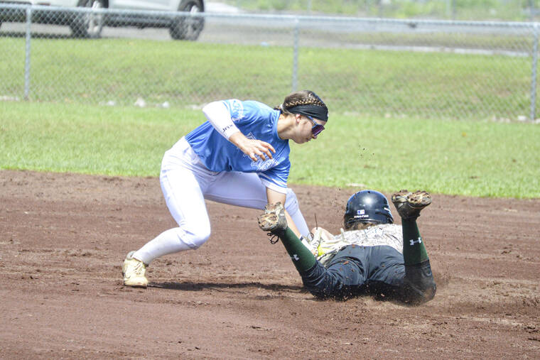 CONNOR WHITT/Tribune-Herald Kealakehe shortstop Malia Polimino tags out a runner at second base during a game against Pahoa on Tuesday, March 12 at Walter Victor Baseball Complex in Hilo.