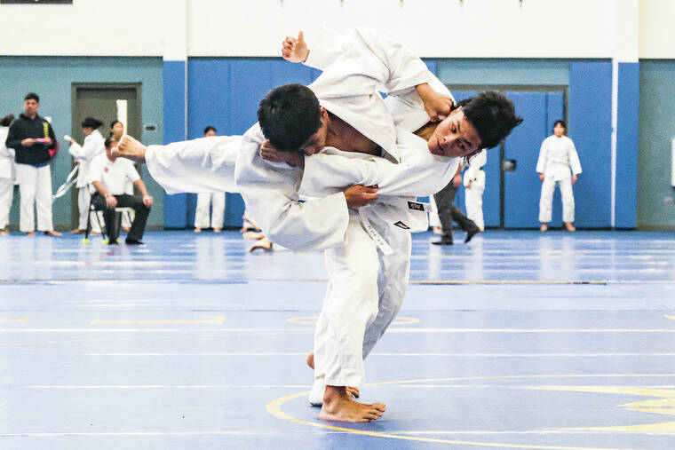 CONNOR WHITT/Tribune-Herald Kea‘au High's Kaedison Ishibashi throws Konawaena's Abram Utrera during Hilo High's invitational judo meet on Saturday.