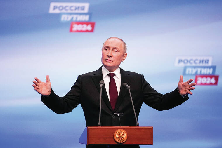 President Vladimir Putin extended his reign over Russia in a landslide election whose outcome was never in doubt, declaring his determination Monday to advance deeper into Ukraine and dangling new threats against the West.