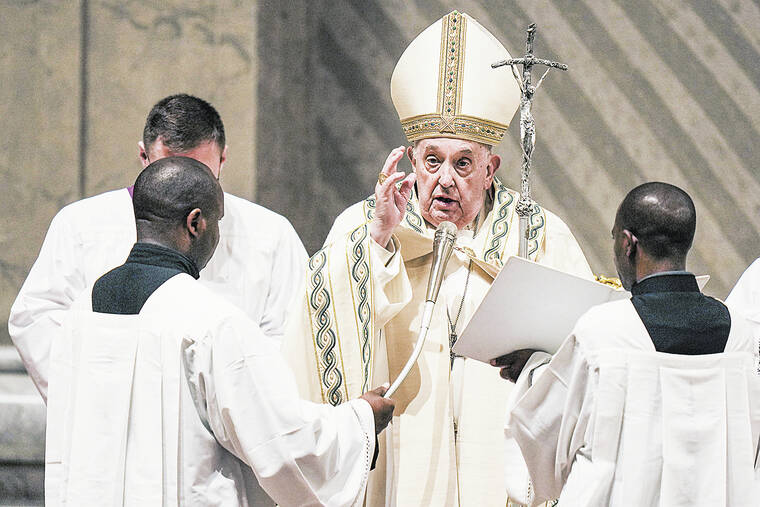 ROME — Pope Francis presided over the Vatican’s somber Easter Vigil service on Saturday night, delivering a 10-minute homily and baptizing eight people, a day after suddenly skipping the Good Friday procession at the Colosseum as a health precaution.