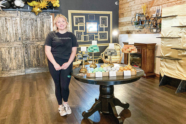 Kalee Hume stands alongside her handmade eclipse-themed soaps at her shop in downtown Waxahachie, Texas, on Saturday, April 6, 2024. Waxahachie will be in the path of totality for Monday's eclipse of the sun. (AP Photo/Marcia Dunn)