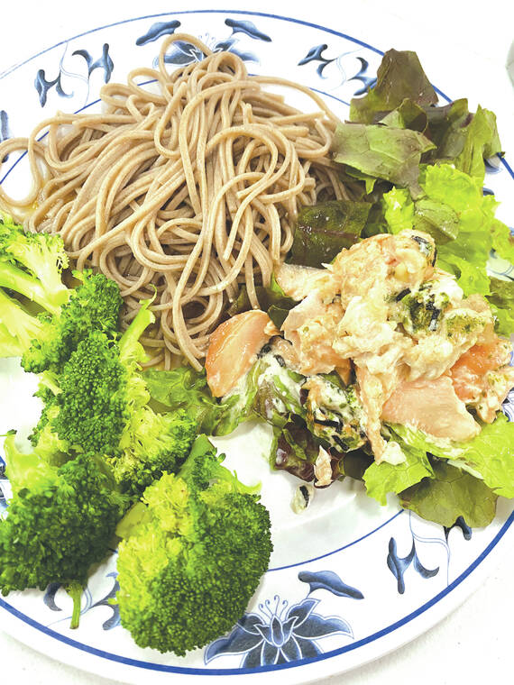 Quentin’s dinner of vegetables, soba noodles and roasted salmon. (Audrey Wilson/Courtesy photo)