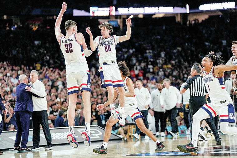 UConn won its sixth overall title and joined the 2006-07 Florida Gators and the 1991-92 Duke Blue Devils as just the third team to repeat since John Wooden’s UCLA dynasty of the 1960s and ’70s.
