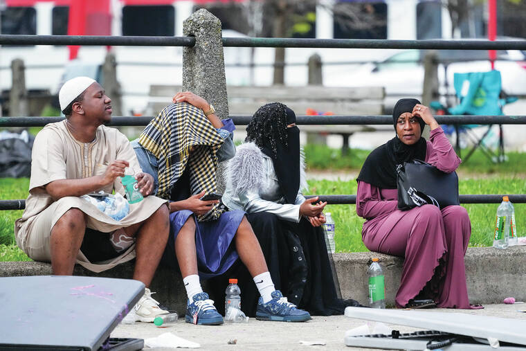 Police investigated the aftermath late Wednesday afternoon at Clara Muhammad Square, which was strewn with debris including blankets, strollers, coolers and a number of shoes, left behind by celebrants. A doll with a plastic wrapper nearby lay abandoned in the grass near a playground surrounded by police tape and guarded by officers. A few tables with aluminum containers of food to break the fast of Ramadan sat in the middle of the park, surrounded by yellow crime scene tape. Two tubs of melted bright red water ice were spilled onto the sidewalk.