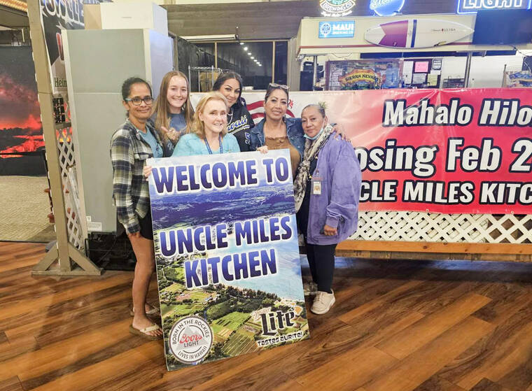 Courtesy of Denise Nakanishi Denise Nakanishi, center, and staff of Uncle Miles Kitchen pose for a photo on the last day of business before vacating the Hilo International Airport on Wednesday, Feb. 28, 2024.