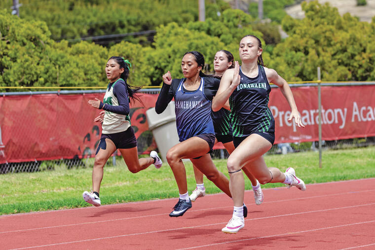 Kamehameha Schools-Hawai‘i’s Kahiau Poe won his sixth 100-meter dash with another top-10 time in Hawai‘i — 11.01s. In the 200-meter dash, three Wildcats placed in the top three — Carmine Taetuna-Fautanu (22.72s), Malu Tan (23.31s) and Lucas Carvalho (23.56s).