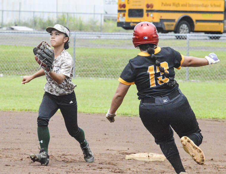 Kohala’s Savannah Kupukaa (13) steals second base while Pahoa’s Ari Kobayashi looks to make a catch during a game on Friday in Hilo. (Photo: CONNOR WHITT/Tribune-Herald)