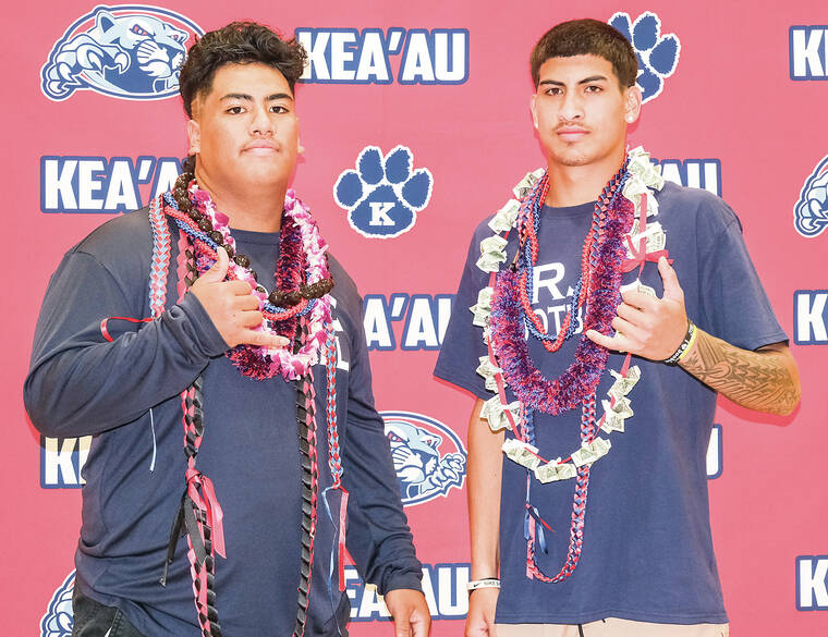 For the second time in the past two weeks, a pair of Kea‘au High senior football players inked college commitments — as center Josh Nihoa and receiver Sean Randall held a ceremony announcing their pledges to play for Santa Rosa Junior College on Thursday afternoon at the Kea‘au HS gym.