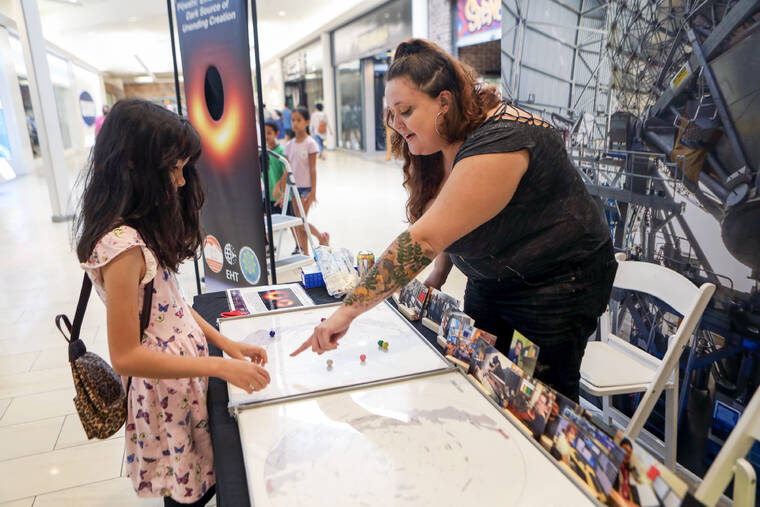 Kelsey Walling/Tribune-Herald Jasmin Silva helps keiki learn about black holes and how to find them during last year's Astro Day at Prince Kuhio Plaza.