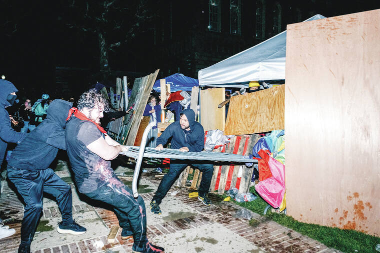 A day later, tension mounted after reports that a Jewish student had been blocked by the pro-Palestinian group as he tried to get to the nearby library. Campus police had to intervene when about 60 pro-Israel demonstrators tried to enter the encampment and a fight broke out.