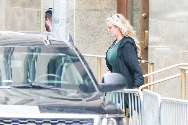 Daniels, wearing a dark green dress and a black duster, showed a sensitive side at odds with the defense’s gold-digging portrayal. When a prosecutor asked her a final question — whether her experience with Trump had been a net positive or negative — she choked up.
