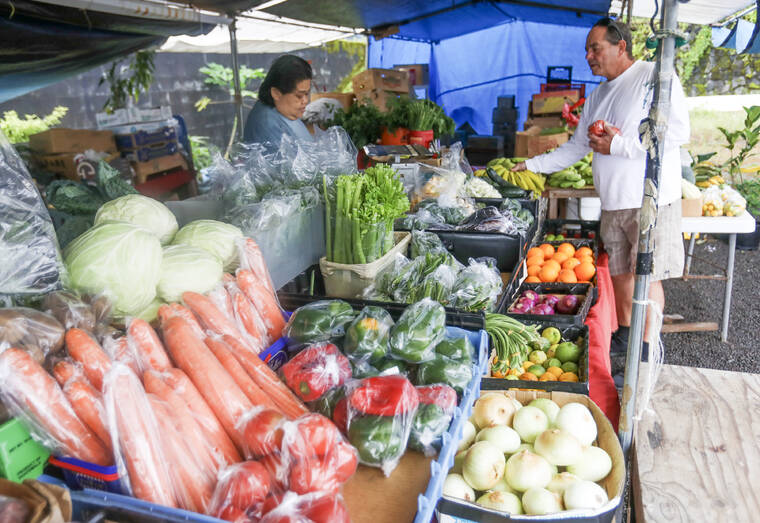 Kelsey Walling/Tribune-Herald Shoppers look through fresh fruits and vegetables from Conchita's Produce Friday in the Keaau Farmers Market.