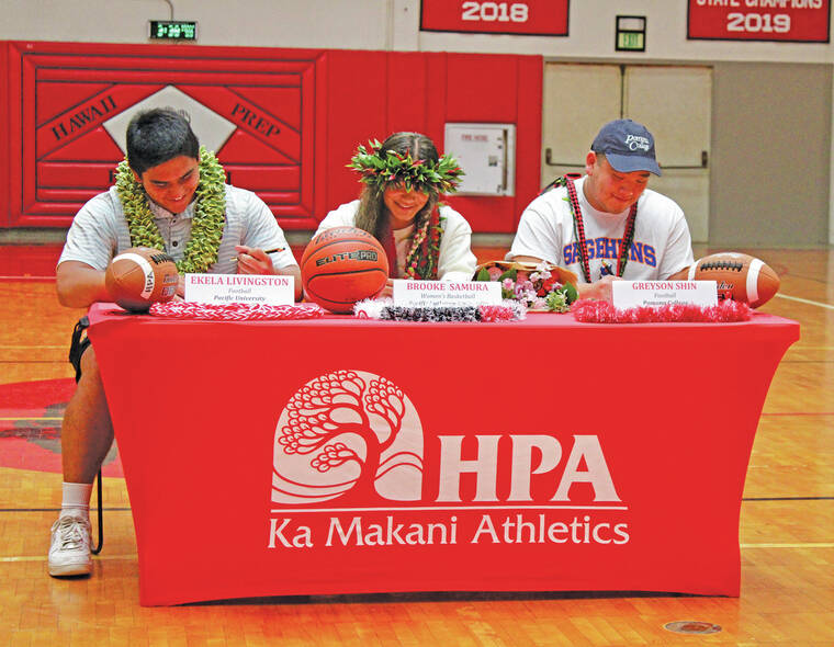 Former HPA football stars Ekela Livingston (running back, linebacker) and Greyson Shin (center) were the other two HPA athletes that signed college commitments. Livingston will play for Pacific University in Honolulu, while Shin will take his talents to Pomona College in Claremont, Calif. Both schools are Division III programs.