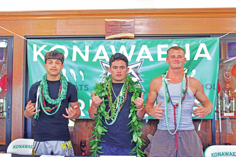 Wednesday’s signing day at Konawaena High School featured three senior superstars inking letters of intent to wrestle next season at Northwest College in Powell, Wyo. — Akea Cariaga, Sunny Espinoza and Race Moxley.