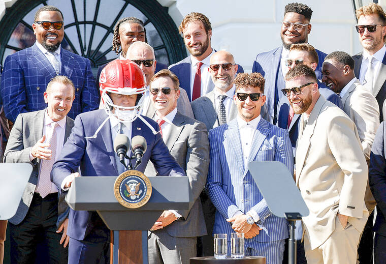 He also joked with Travis Kelce, the team’s star tight end, who is dating singer Taylor Swift, calling him up to the podium briefly. Swift, on tour in Europe, did not appear.