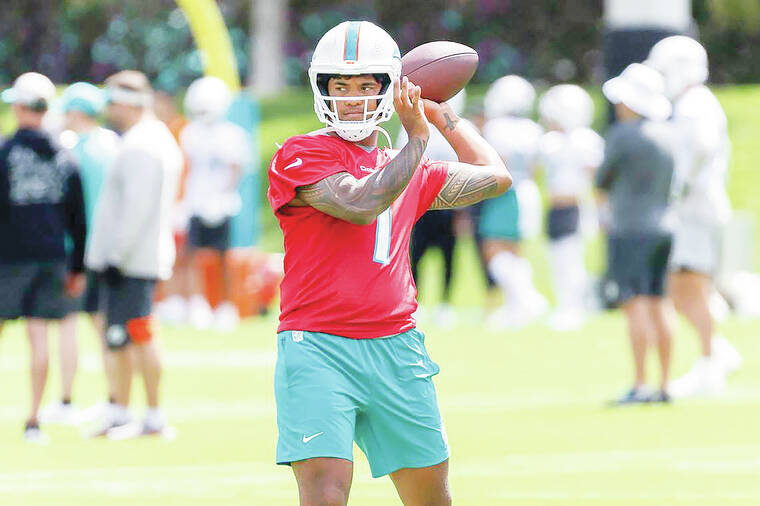 MIAMI — Tua Tagovailoa continues to sit out the Miami Dolphins’ 11-on-11 work while his camp negotiates for a multiyear contract extension, but the team’s starting quarterback was dealing during the 7-on-7 periods he threw in during Tuesday’s practice.