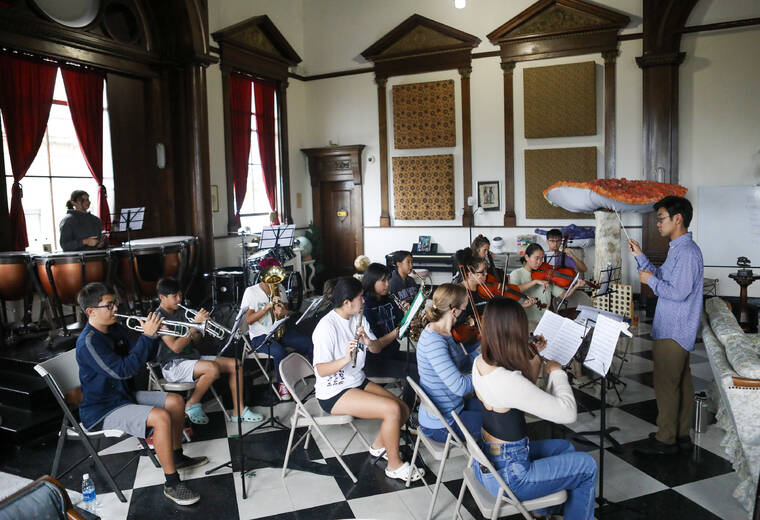 Kelsey Walling/Tribune-Herald Maestro Conner Yoshimoto leads the Hummingbirds Youth Philharmonic as they work through a piece during a rehearsal June 1 at the Hawaii Science and Technology Museum in Hilo.