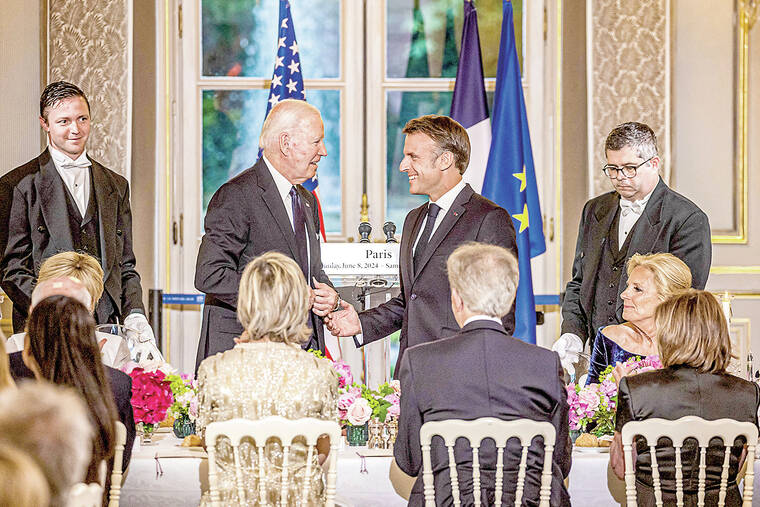PARIS — U.S. President Joe Biden and French President Emmanuel Macron on Saturday stressed how much they agree with each other about world affairs, including the war in Ukraine, even as their countries have expressed sharply different views of the fighting in the Gaza Strip between Israel and Hamas.